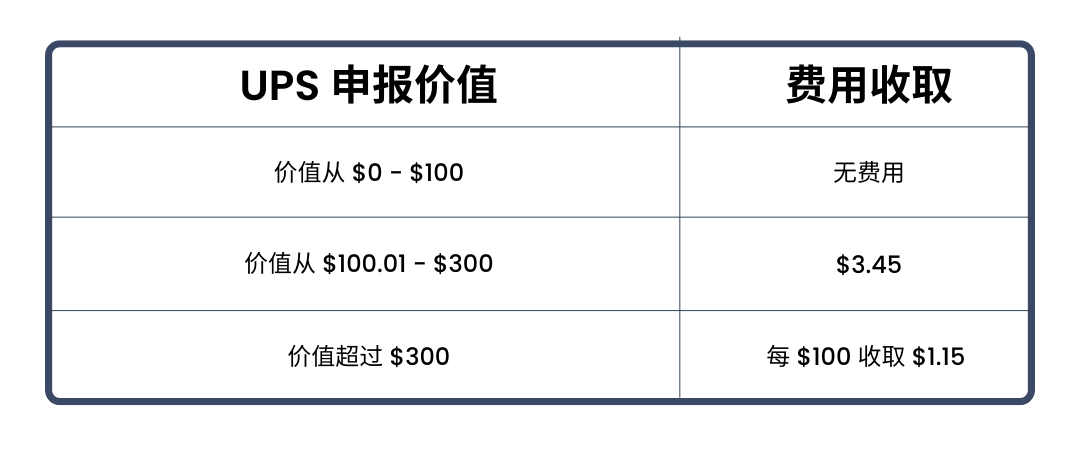 正如剛剛提及的,UPS不超100美元的申報價值基本都是免費的。可是假如在100>n<300這一個區間,將要收取3.45美元。假如大于300美元,每100美元的申報價值會收取1.15美元。