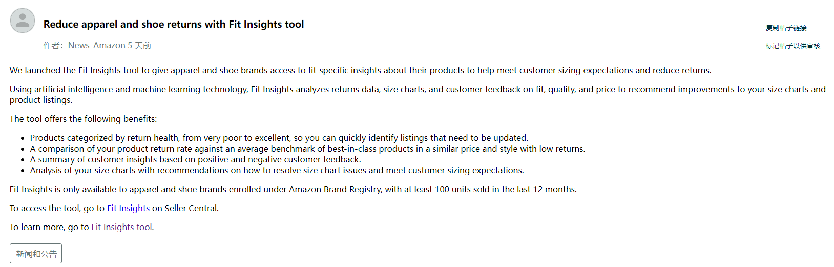 亞馬遜在公告中提到,F(xiàn)itInsights工具可分析退貨數(shù)據(jù)、尺碼表以及客戶對(duì)尺碼、質(zhì)量和價(jià)格的反饋,由此提議賣家對(duì)品牌尺碼表和產(chǎn)品列表進(jìn)行優(yōu)化。