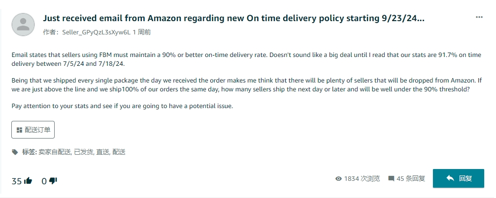 “好吧,我感覺我是完了,一直以來都是當天發貨,但準時率就只有88%,USPS一直有著延誤的情況,我能怎么辦?”