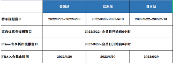 亞馬遜官方已確定了今年P(guān)rimeday會(huì)在7月開(kāi)展,盡管沒(méi)有具體到日期,可是賣家清楚個(gè)大概就可以了,只要不像去年提早到6月就可以了。下面便是各個(gè)站點(diǎn)的活動(dòng)提報(bào)期限和入倉(cāng)截止時(shí)間。